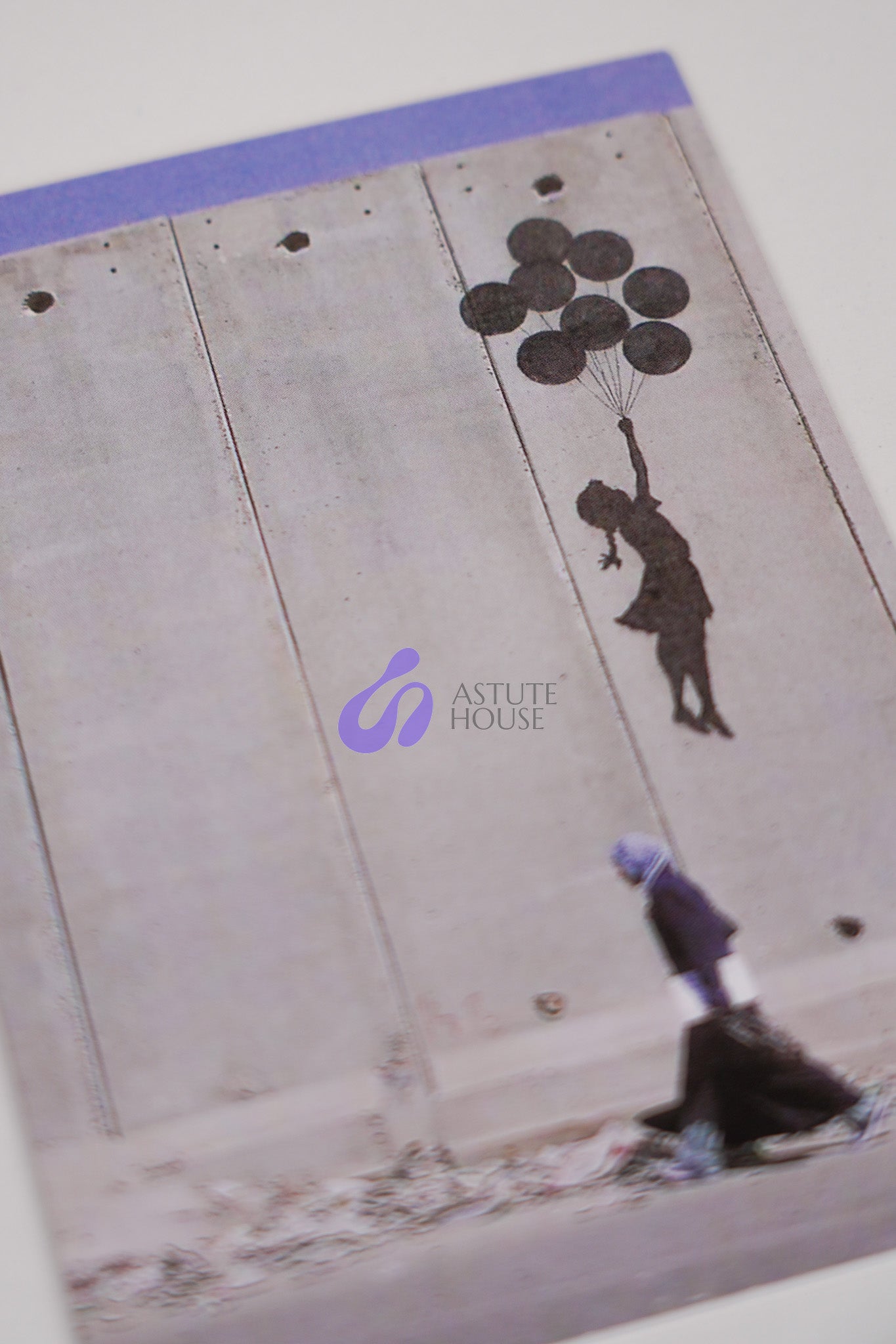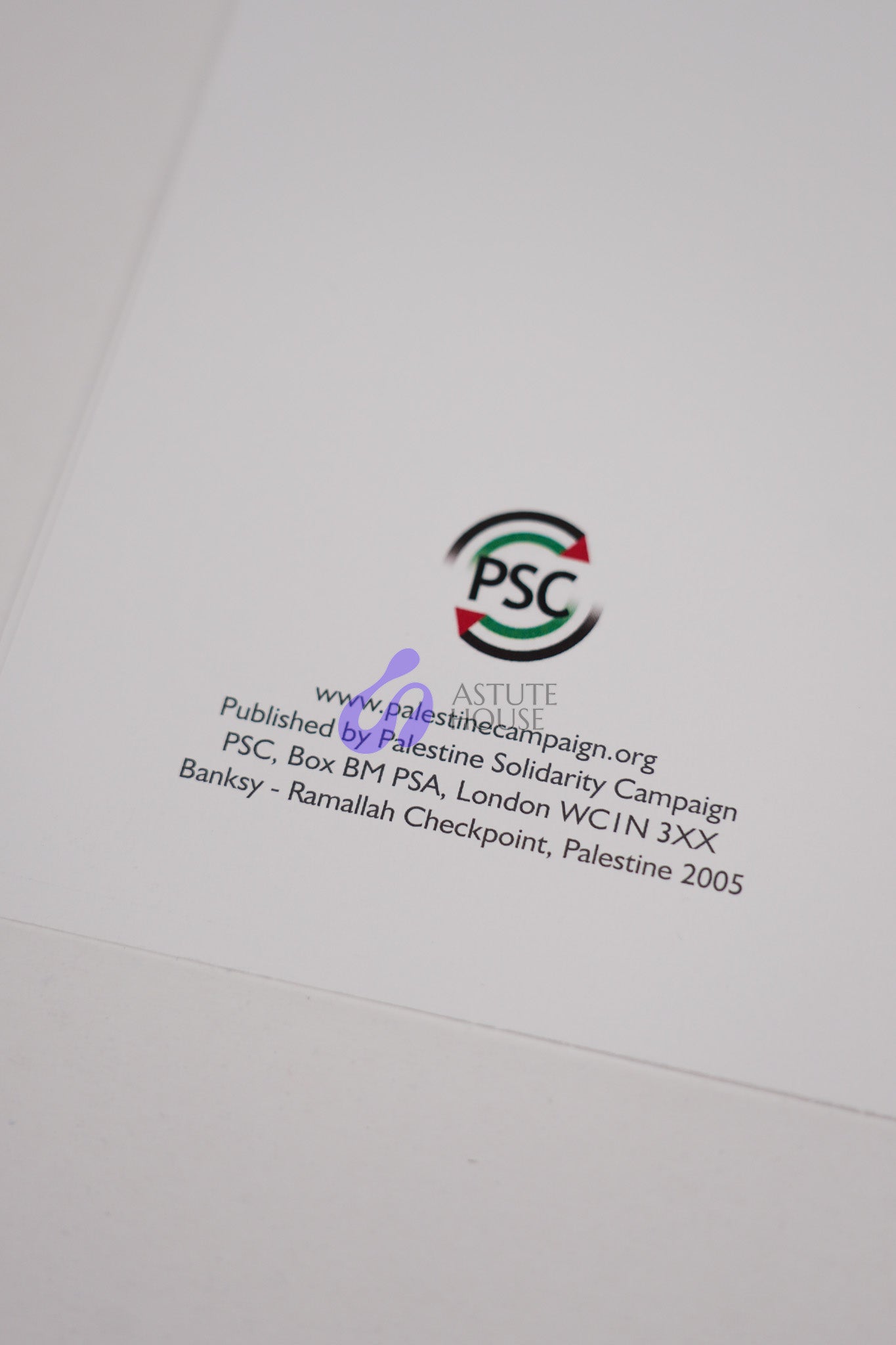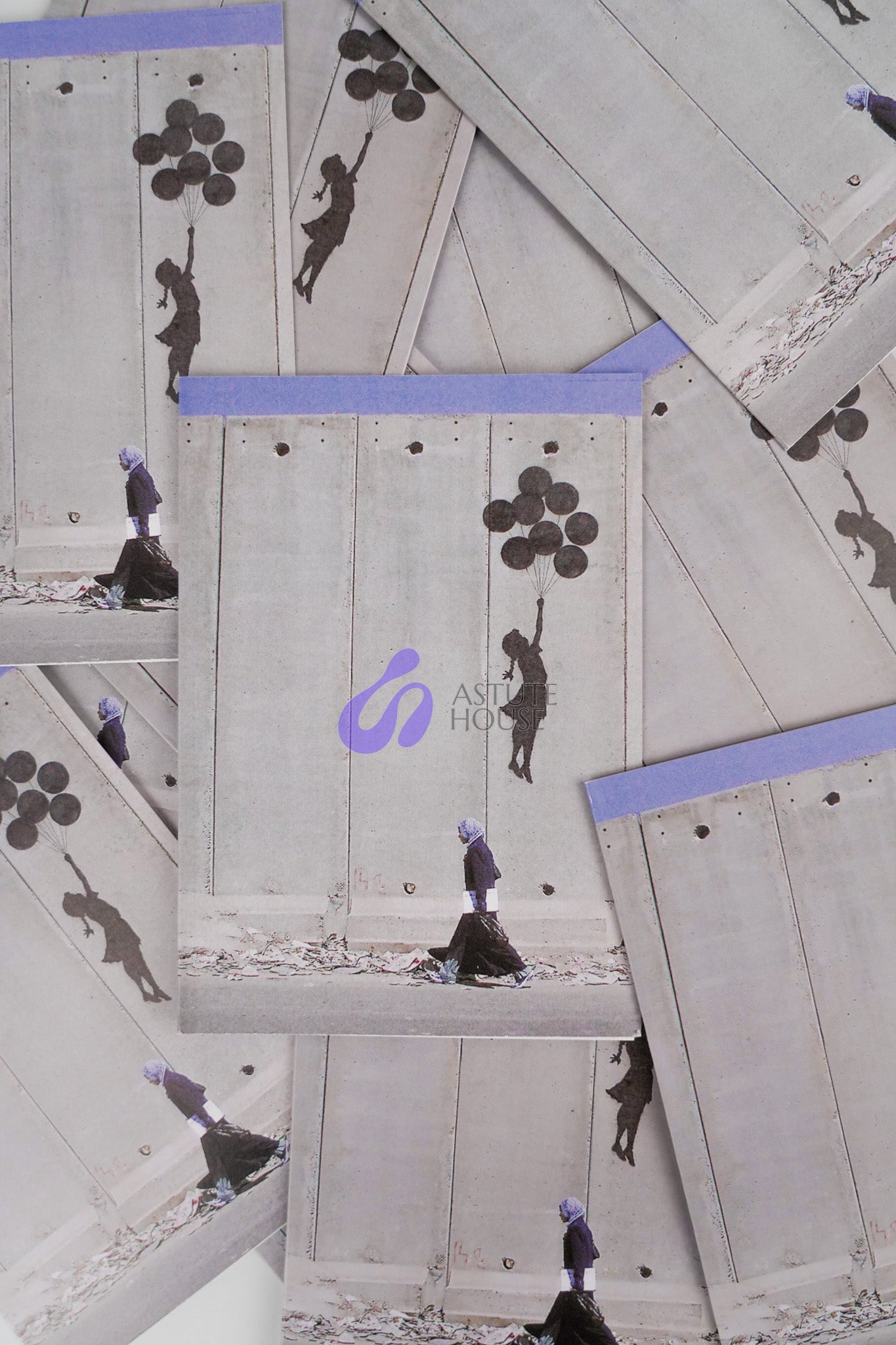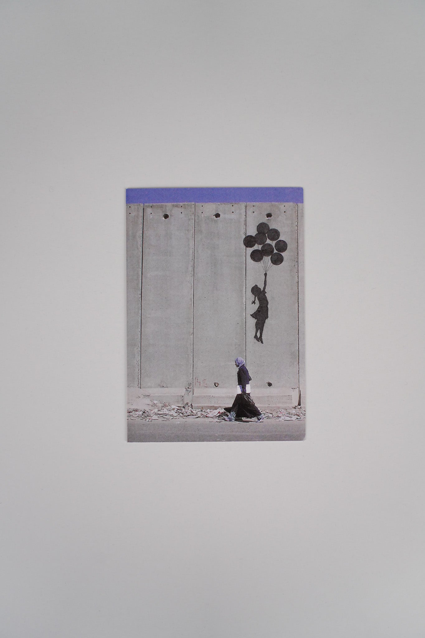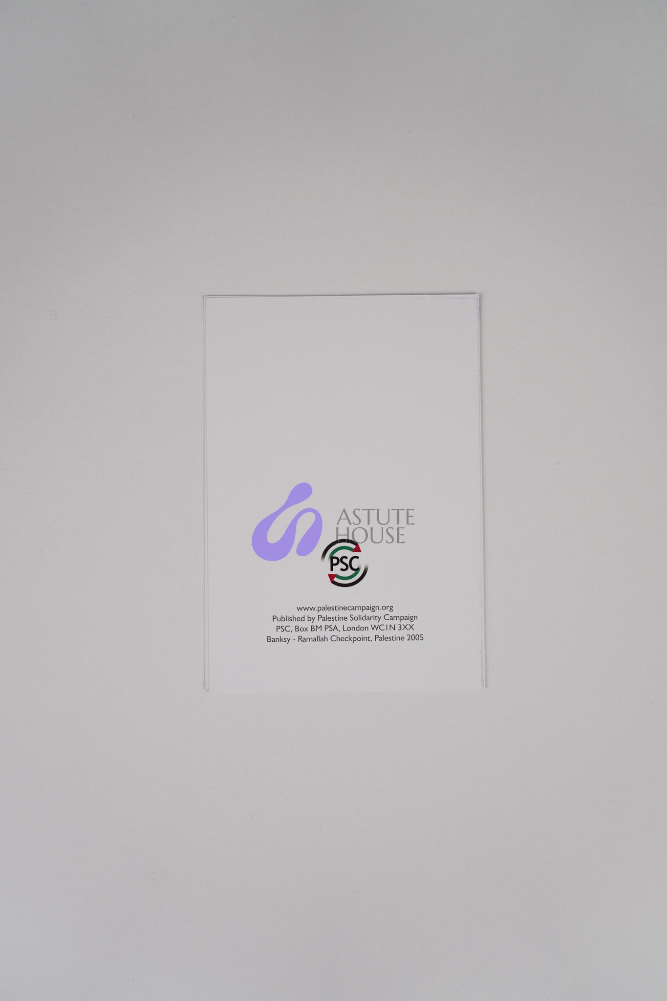 ▫️ This greeting card features an image of a Palestinian woman walking past an iconic Banksy mural on the separation wall near the Ramallah checkpoint, Palestine — a striking symbol of hope and resistance.
