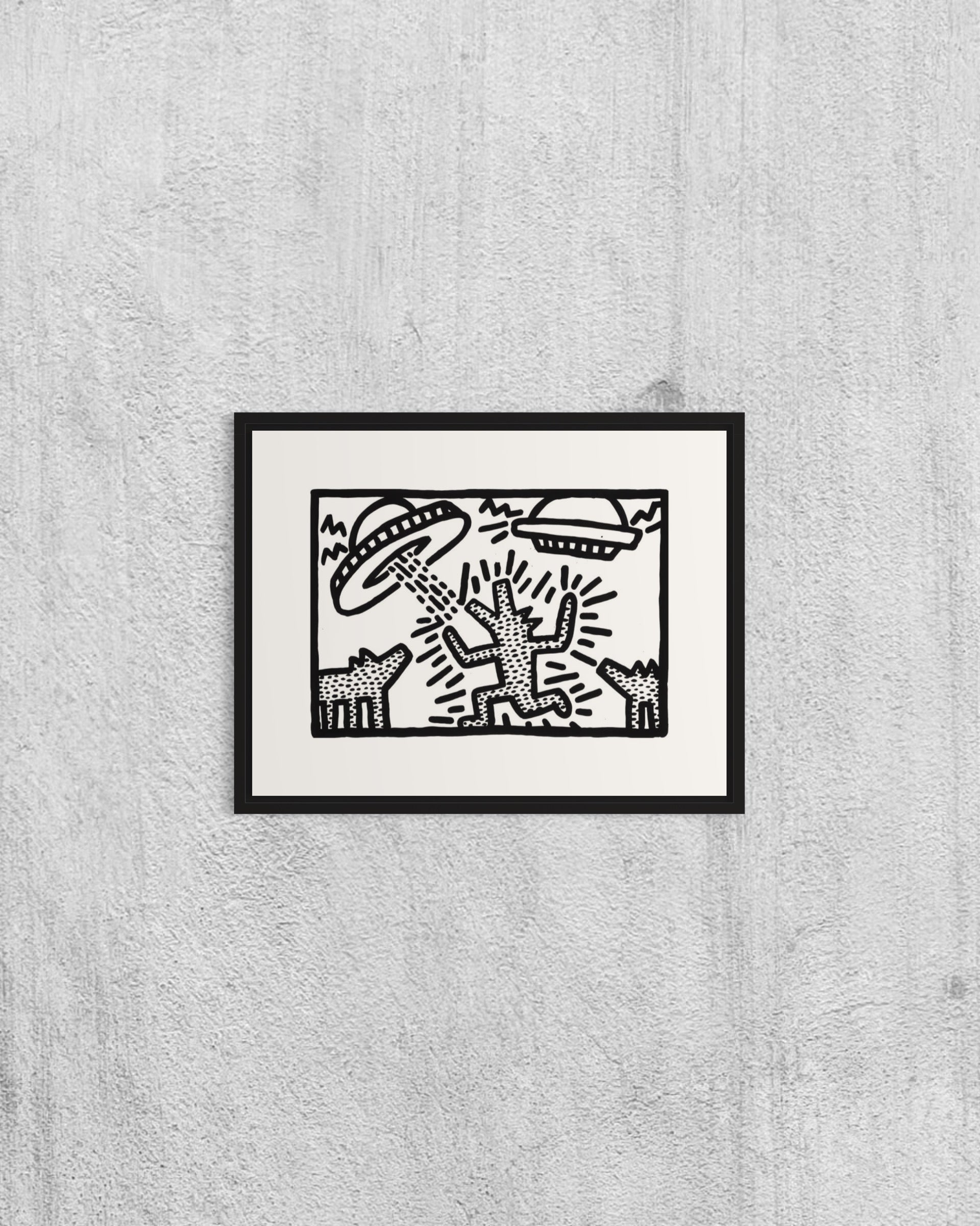 In Untitled, 1982 (Dogs with UFOs), Keith Haring combines his iconic barking dogs with playful UFO motifs. The piece showcases Haring's signature visual language of bold lines and dynamic movement, reflecting his exploration of technology, human connection, and the unknown. The barking dogs, a recurring symbol in his work, evoke themes of power and communication, while the UFOs add an element of mystery and fantasy. Created during the height of Haring's career, this work exemplifies his ability to merge pop culture with deeper social commentary in a universally accessible style.
