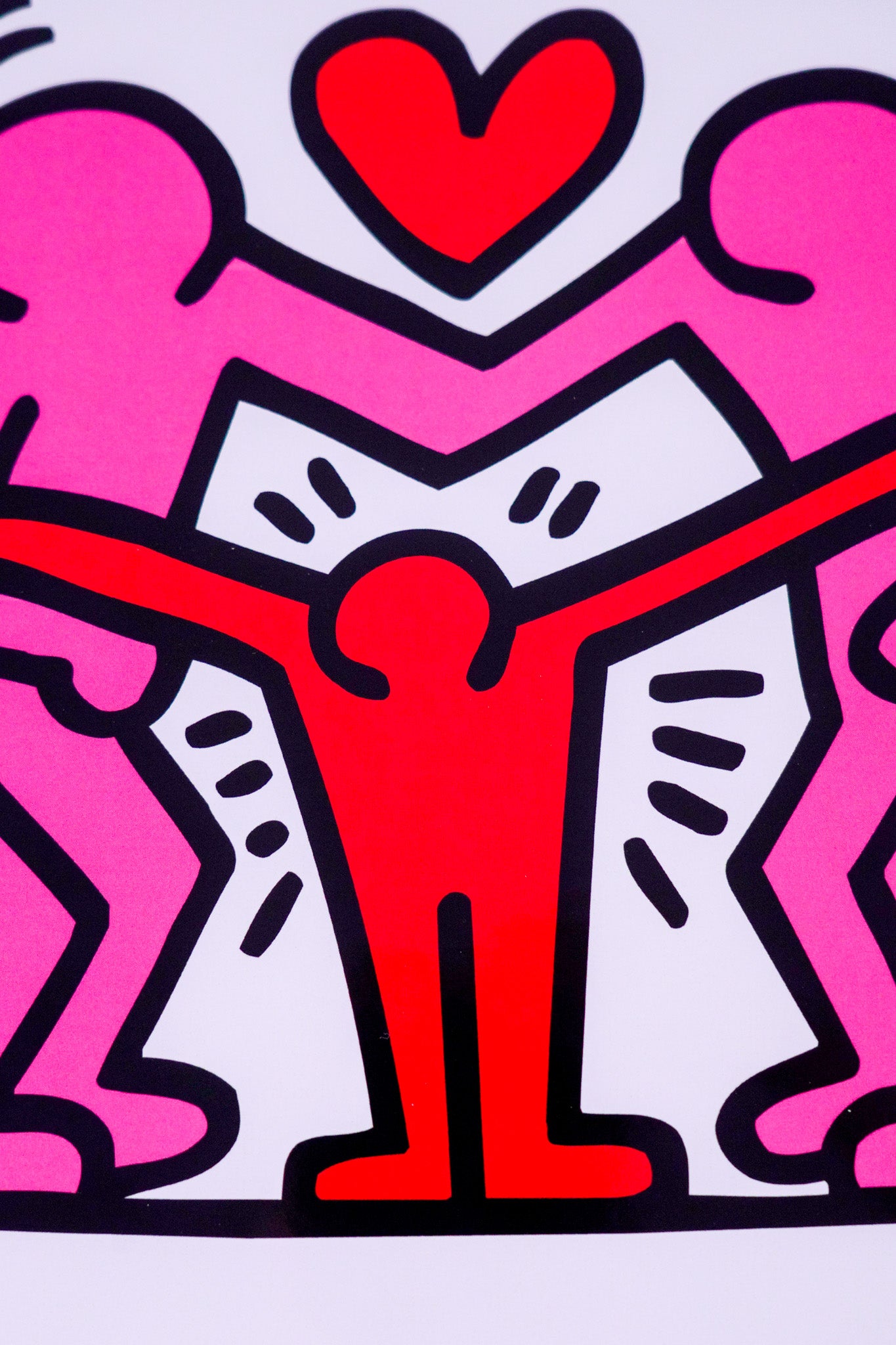 'Untitled' (Family) by Keith Haring exemplifies the artist's iconic style with its vibrant colors and bold, simple lines. The piece depicts a group of figures interconnected in a joyful embrace, symbolizing unity and the importance of family. Haring's work often transcends age, race, and gender, emphasizing universal themes of love and togetherness.